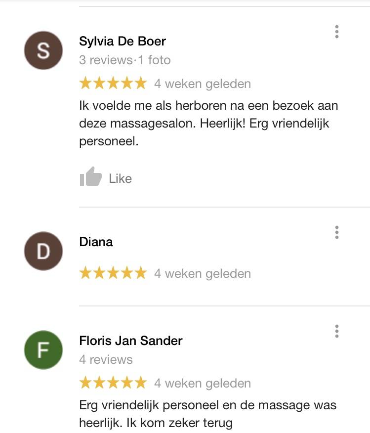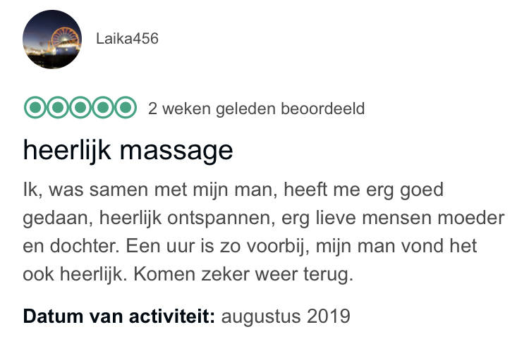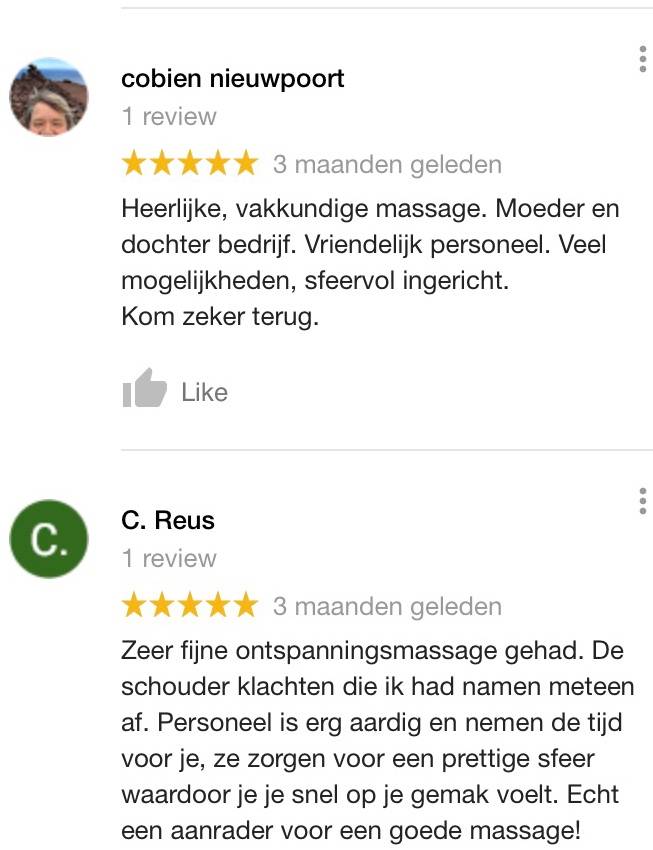 Ik voel mij verplicht een reactie achter te laten. I.v.m mijn verjaardag een massage geboekt en wat een geweldige behandeling gekregen. Ik adviseer een ieder om hier een behandeling te boeken. U zult er geen spijt van krijgen.
