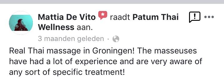 Wij hebben gister voor het eerst bij Patum Thai een ontspanningsmassage gehad. Heerlijke massage met aandacht, respect, en zorg!