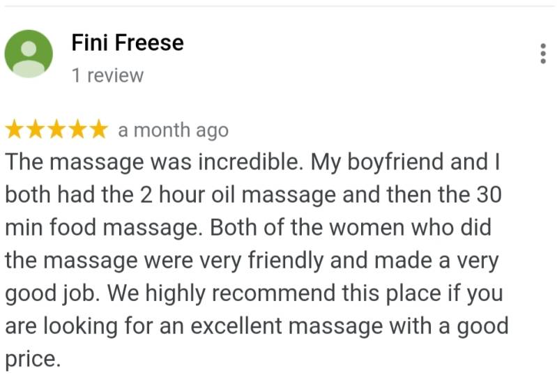 We had a really good time at the Patum Thai wellness. My boyfriend and I both had the 2 hour oil massage and then the 30 min food massage. Both massages were incredible. I highly recommend the place to everyone who is looking for a good massage with a really good price.