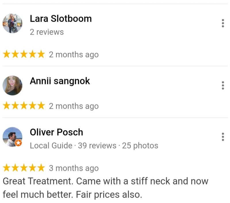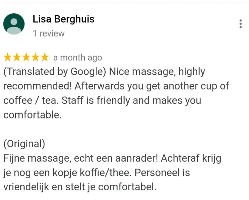 Vandaag voor het eerst geweest. Ik had twee dagen lang last van hoofdpijn en mijn nek en schouders zaten behoorlijk vast. Ik had gekozen voor de anti-stress massage voor 60 minuten. Het was echt heerlijk. Al de punten die vast zaten werden gemasseerd. De vrouw was zeer vriendelijk. Na afloop nog even gepraat. Al met al een zeer leuke ervaring. En ook voor herhaling vatbaar.